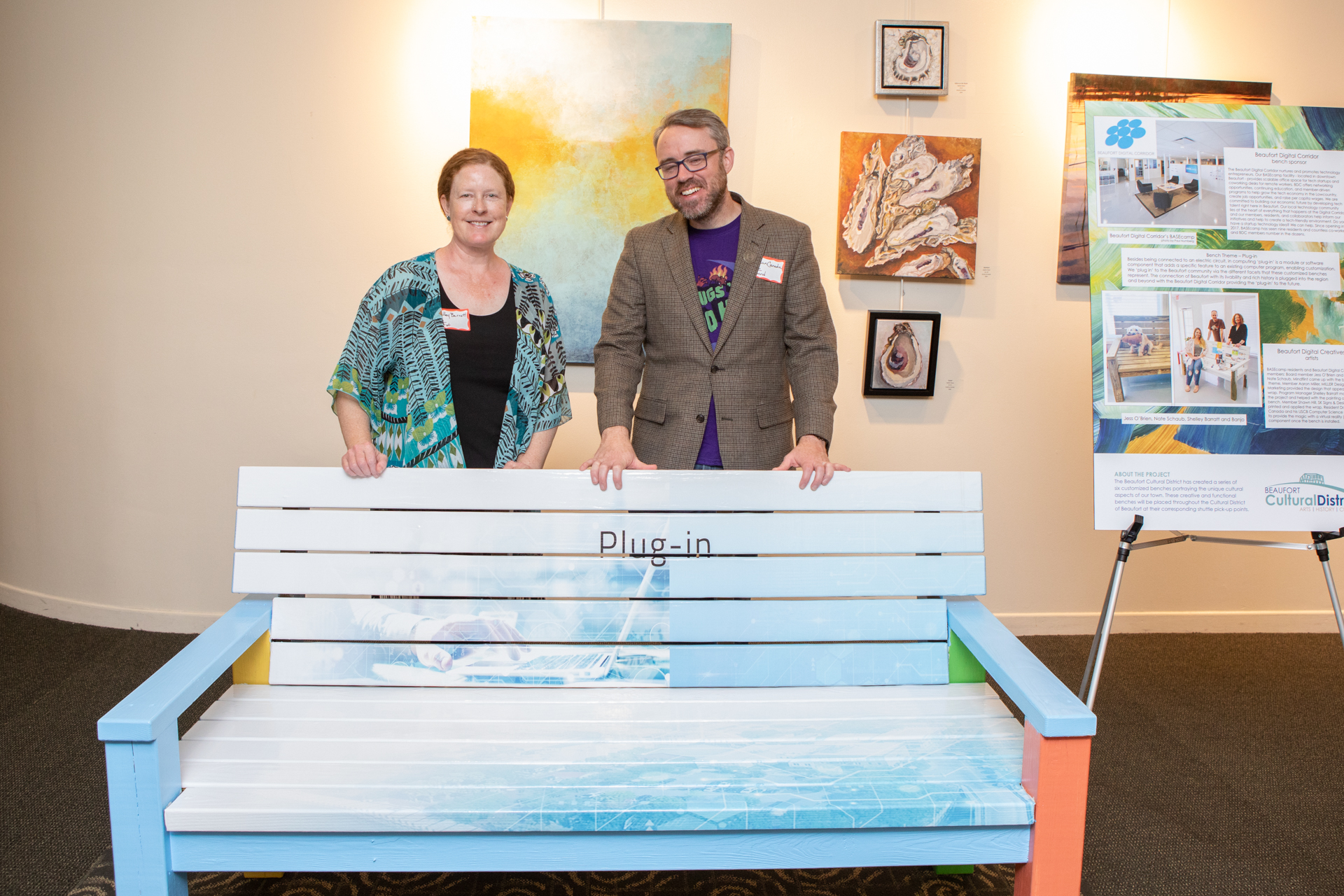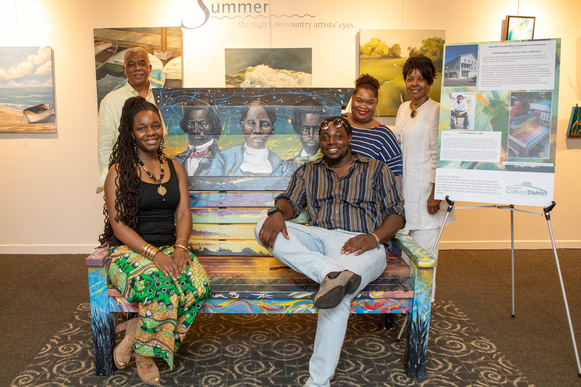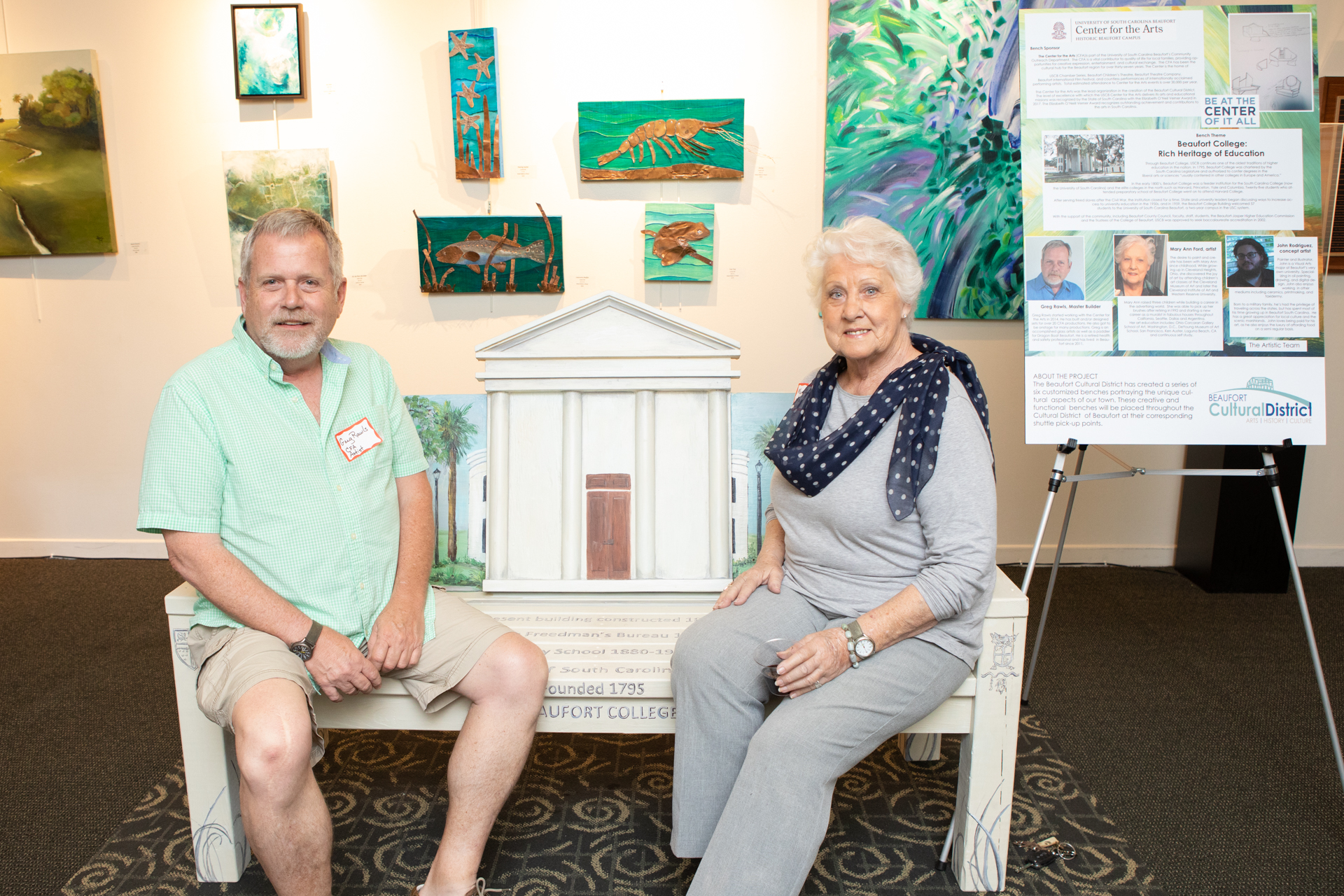 On Friday evening May 10, the city’s Cultural District Advisory Board hosted a “sit-in” at the USCB Center for the Arts. The event highlighted a project that created six customized benches decorated by representatives of local agencies, which will be placed along with the city’s free shuttle pick-up points and will illustrate the unique cultural aspects of downtown Beaufort. The benches were constructed by Habitat for Humanity and decorated by local artists representing: the Beaufort Digital Corridor, Beaufort County Black Chamber of Commerce, Lowcountry Habitat for Humanity, Beaufort Reconstruction Museum, Santa Elena History Center, and USCB Center for the Arts.