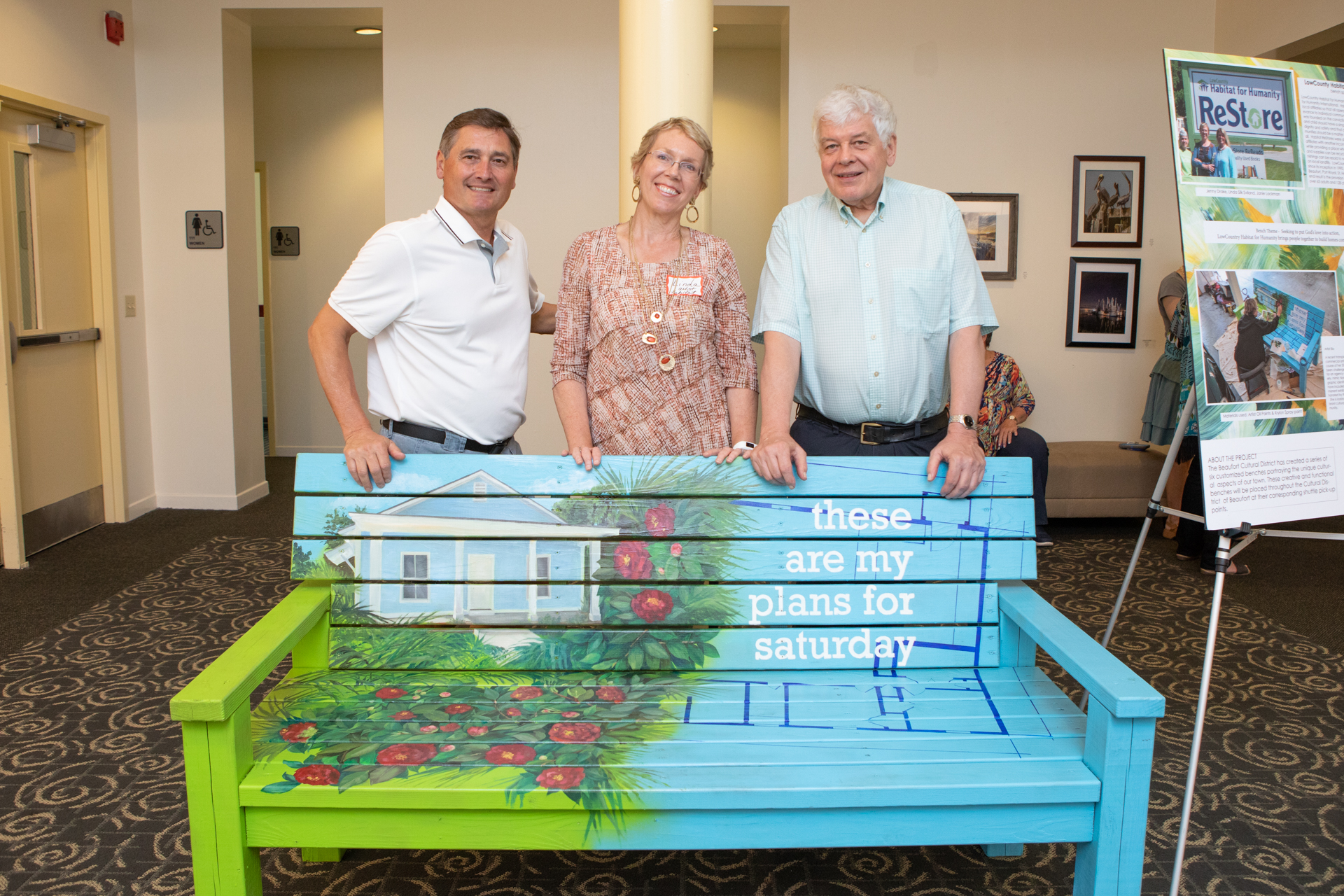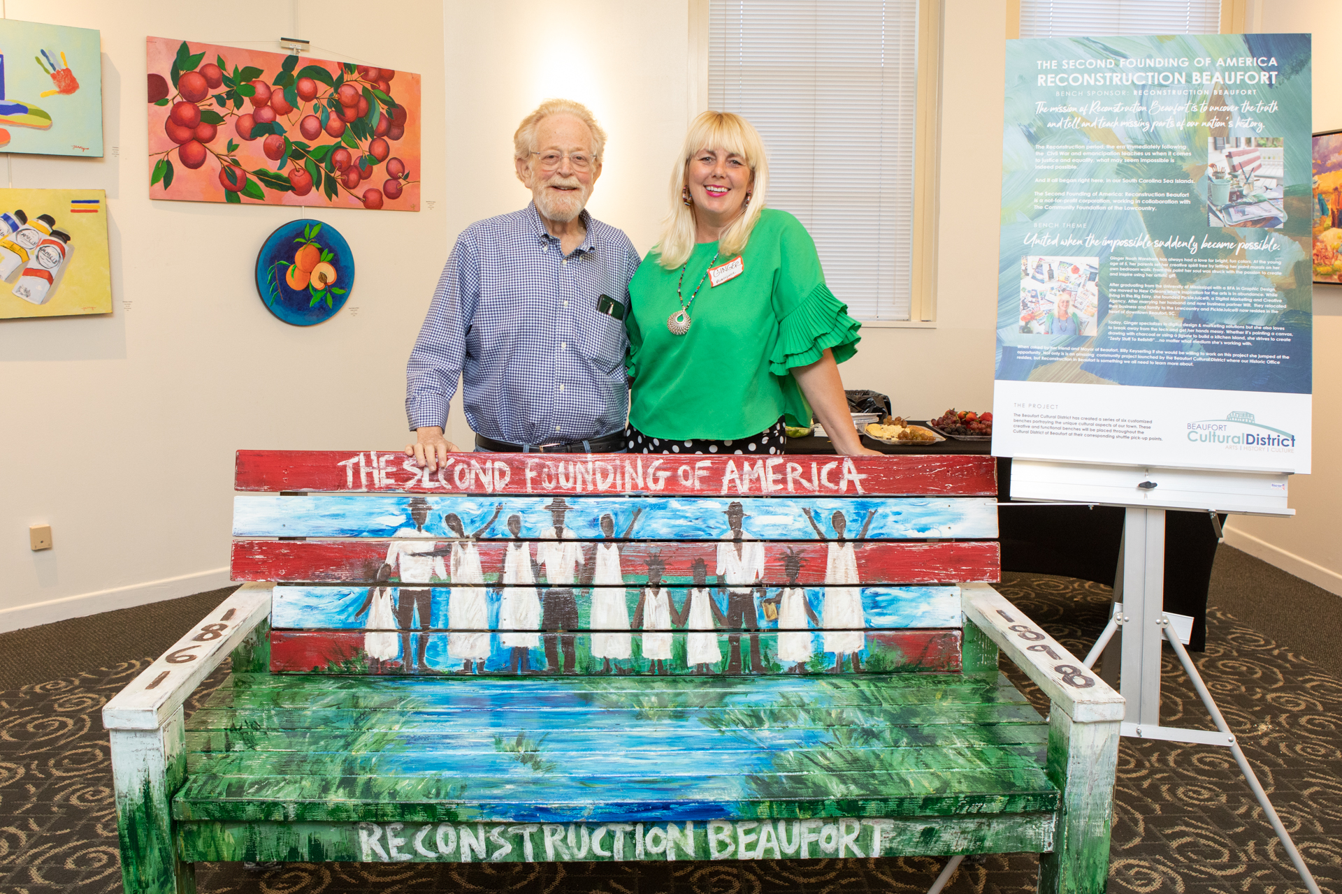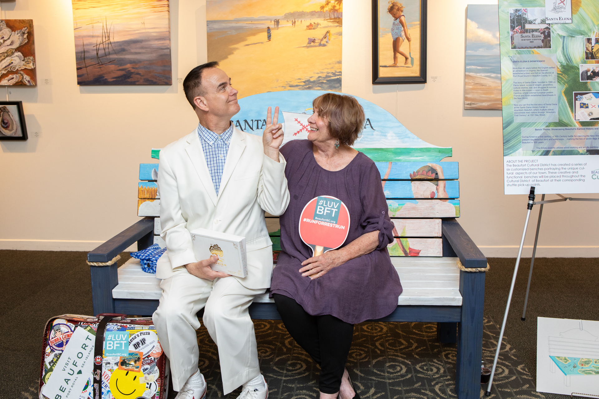 On Friday evening May 10, the city’s Cultural District Advisory Board hosted a “sit-in” at the USCB Center for the Arts. The event highlighted a project that created six customized benches decorated by representatives of local agencies, which will be placed along with the city’s free shuttle pick-up points and will illustrate the unique cultural aspects of downtown Beaufort. The benches were constructed by Habitat for Humanity and decorated by local artists representing: the Beaufort Digital Corridor, Beaufort County Black Chamber of Commerce, Lowcountry Habitat for Humanity, Beaufort Reconstruction Museum, Santa Elena History Center, and USCB Center for the Arts.